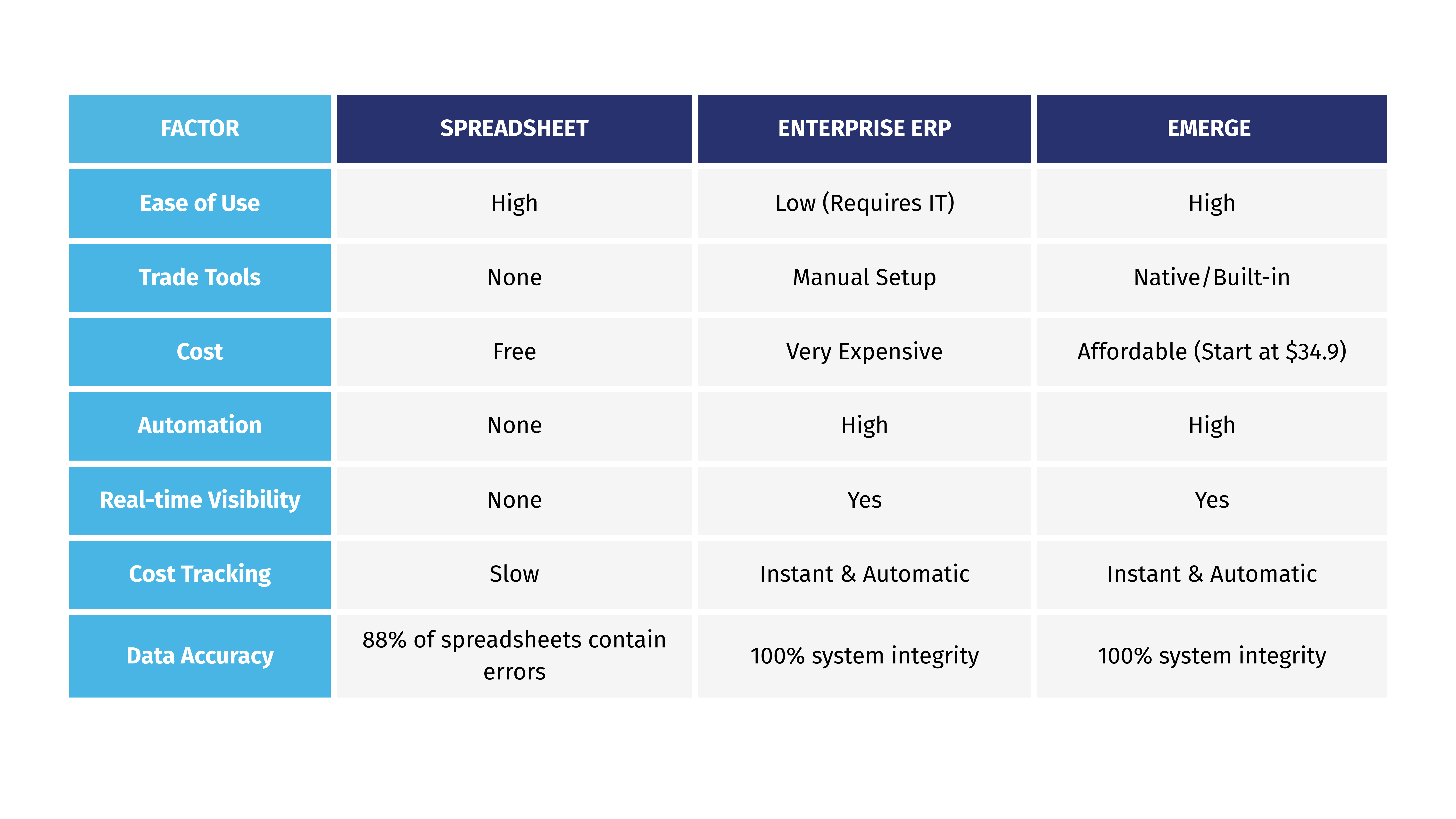 Here are the short comparison between spreadsheets, enterprise ERP, and the ERP inventory management module EMERGE: